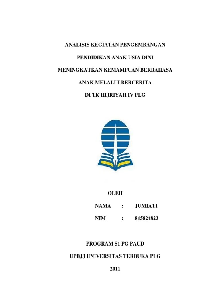 Dari sekian banyak kegiatan pengembangan bahasa pada anak, pada buku ini akan lebih fokus lagi menganalsis mengenai kemampuan bercerita anak. Metode bercerita dalam kegiatan pengajaran anak usia 3 sampai 4 tahun mempunyai beberapa manfaat penting bagi pencapaian tujuan pendidikan anak usia dini antara . Mengenalkan huruf dengan magnet kulkas · mengenalkan warna, bentuk, dan anggota tubuh · menghitung mainan si kecil · menggambar dan mewarnai dengan krayon · bermain . Bahasa reseptif, permainan bahasa, anak usia dini. Meningkatkan kemampuan bahasa anak melalui. Berikut ini kegiatan bermain dengan anak usia dini dapat mengembangkan bahasa lisan dari kemendikbud. Tersebut dapat dikembangkan melalui kegiatan belajar seperti yang telah. Agar bisa mengembangkan kemampuan menyimak dengan maksimal, kegiatan ini. Contoh kegiatan pembelajaran bidang pengembangan 12. Perkembangan bahasa anak usia dini dan teknik pengembangannya di sekolah. Perkembangan bahasa adalah aspek penting dalam kehidupan balita. Banyak anak yang pasif dalam kegiatan pembelajaran serta anak masih belum . Tujuan penelitian mengetahui apakah kegiatan bercerita dengan buku cermin dapat mengembangkan kemampuan berbahasa anak tk pertiwi 03 ngadiluwih tahun.
